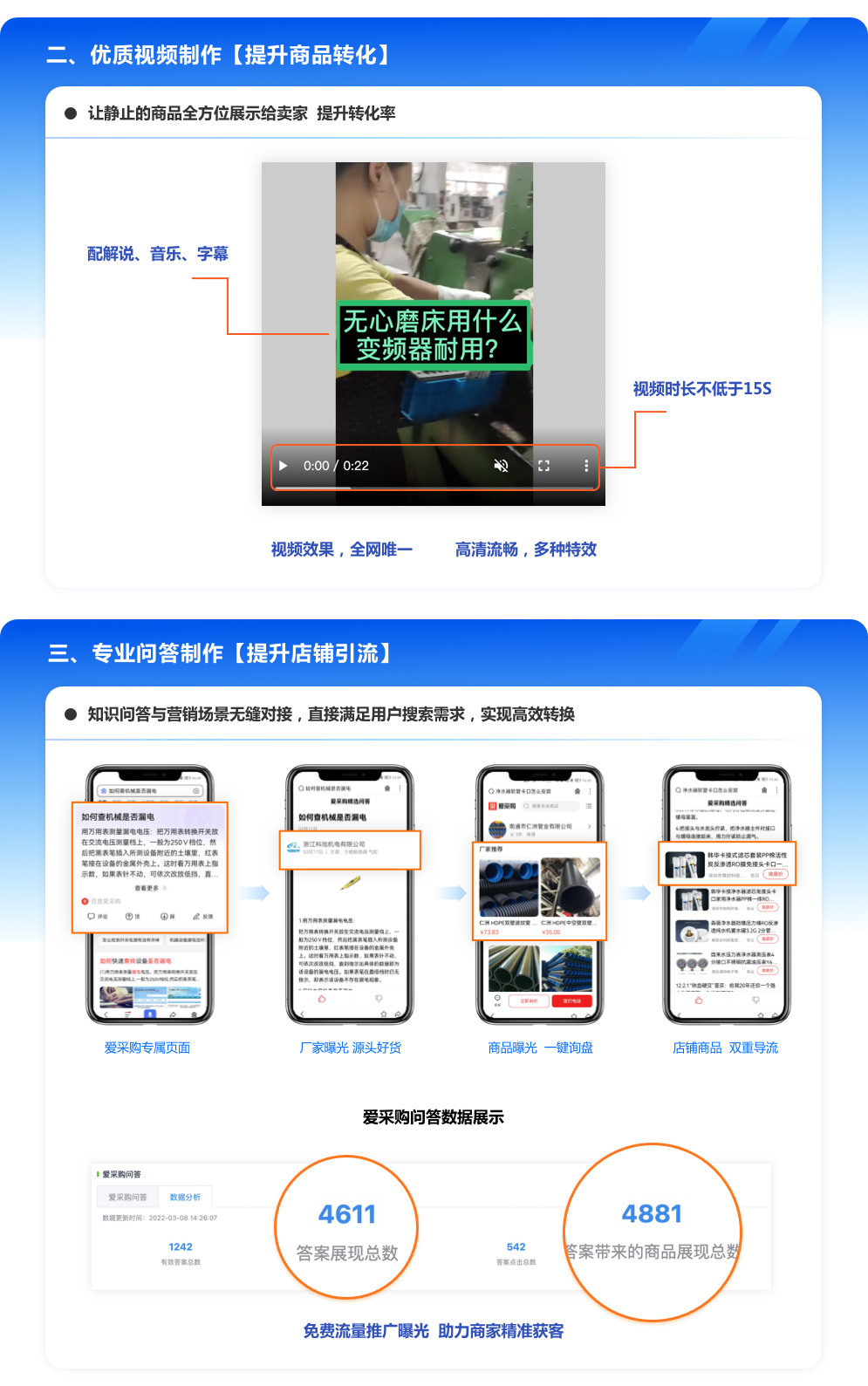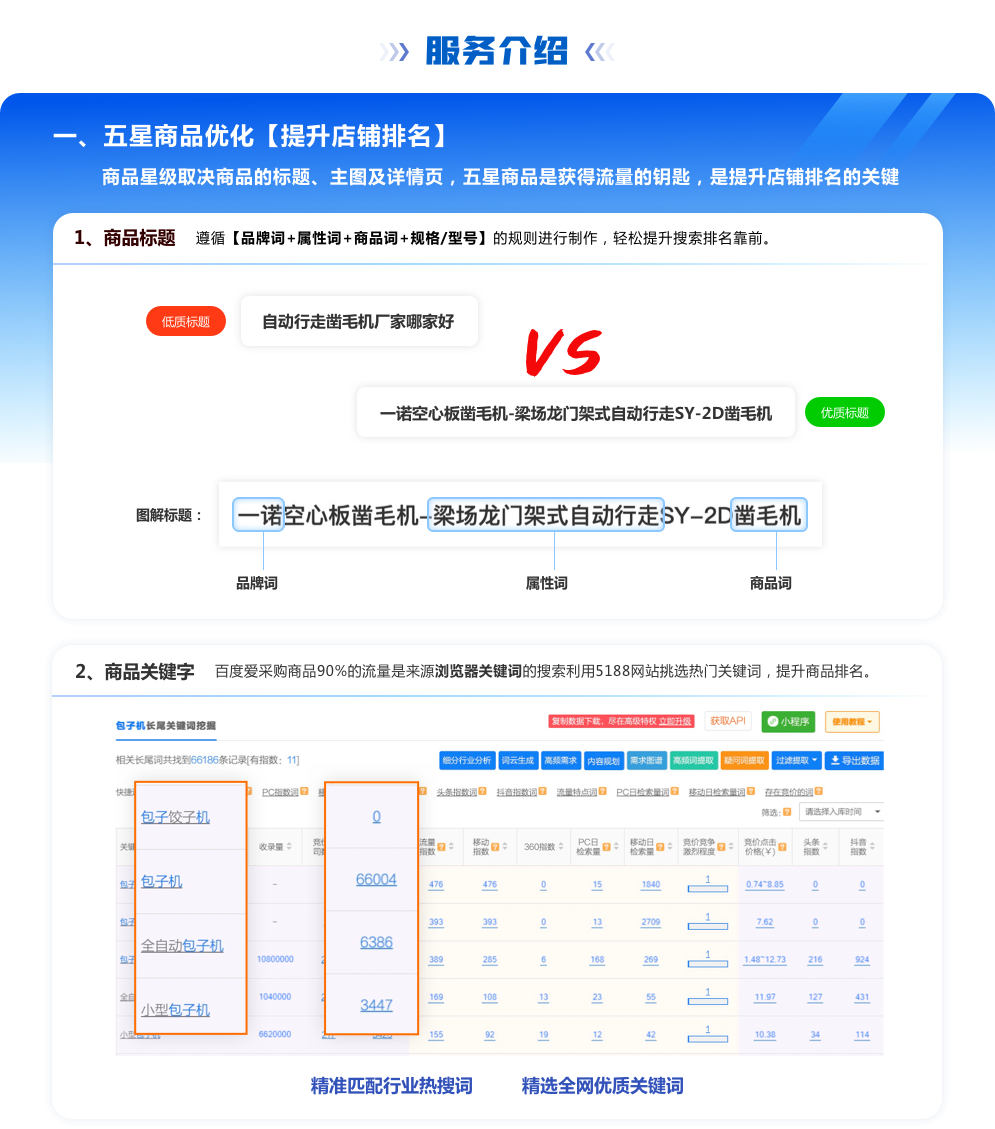 为爱采购商铺包括爱采购商铺资料完善、推荐产品规划、根据产品的关联关系做关联产品的设计、产品分类设置、产品主图设计、详情页、产品视频覆盖等服务。挖掘核心关键词和精准关键词,发布五星级商机,提高客户得浏览量和点击率,提高月度成交率!