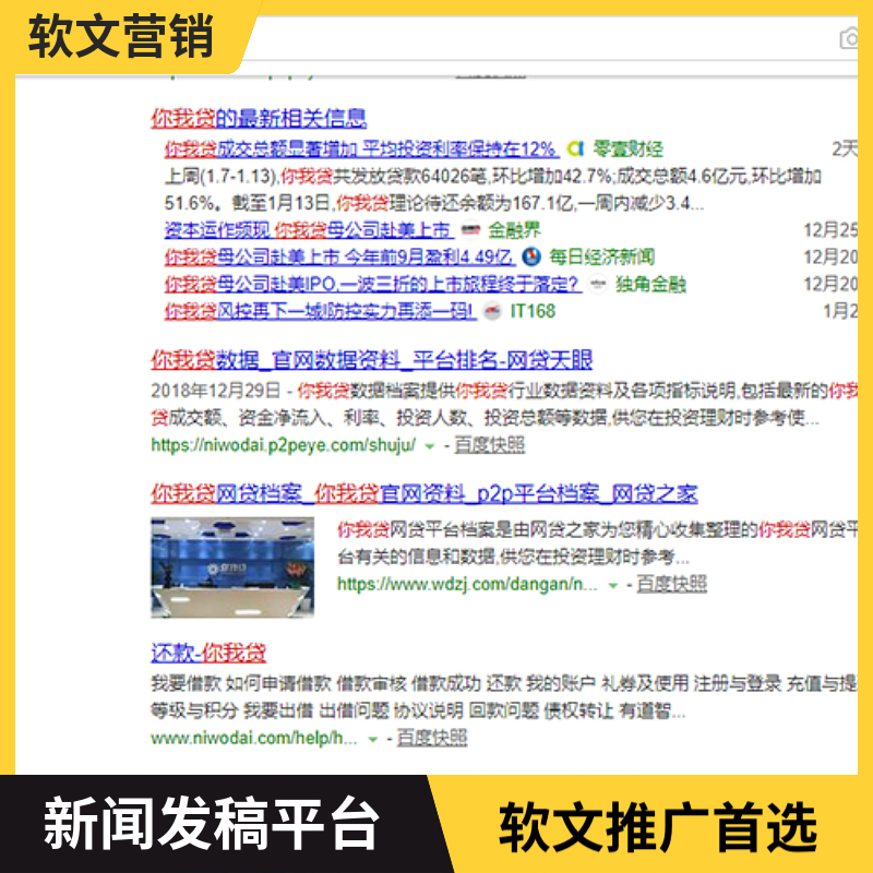 软文营销就是把一篇关于您企业的宣传文章,新闻,会议活动,或者一个新的观点,或者是一篇可以引起读者共鸣的文章发布多家不同新闻媒体上,用户就可以在媒体上,或者从搜索引擎关键字搜索看到相关文章,从而产生广告效果,这就是网络软文营销。